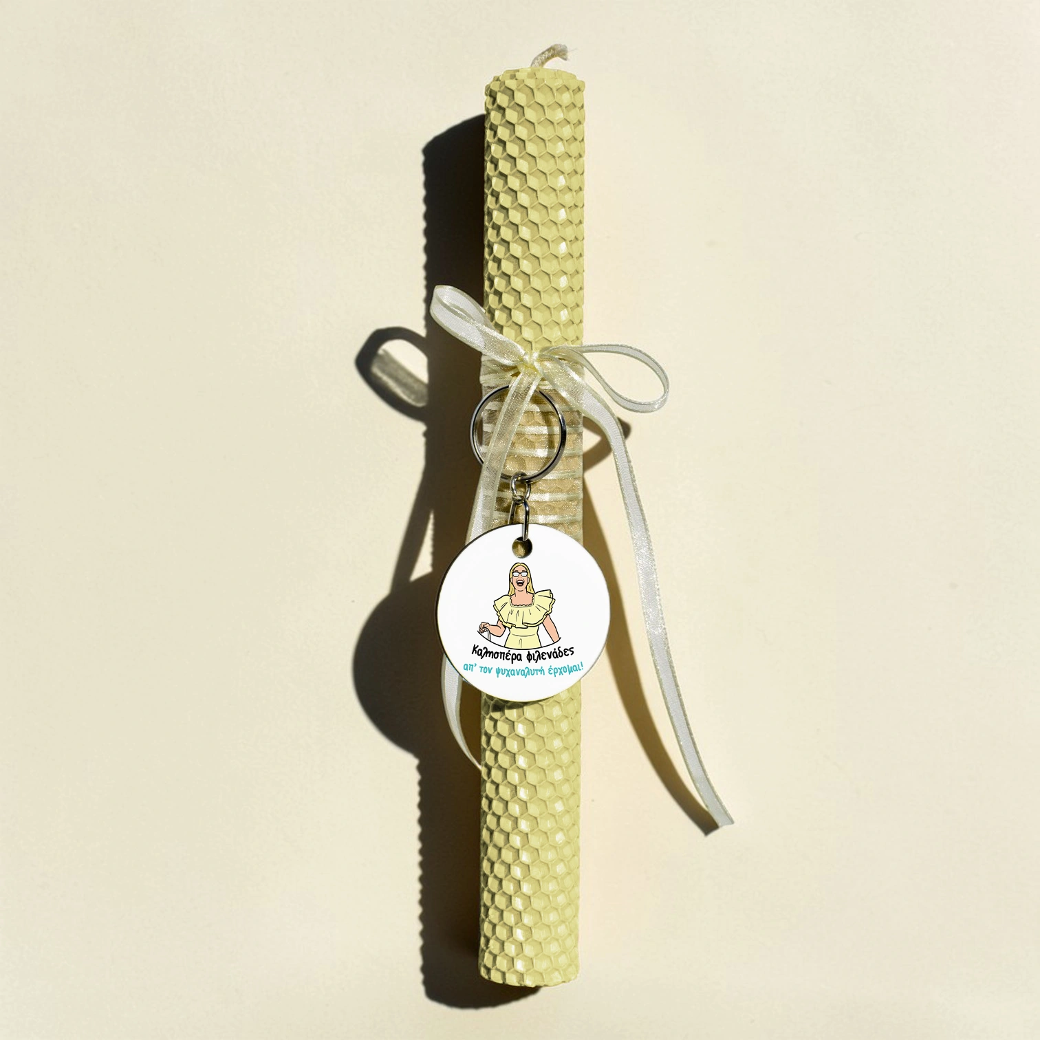 Χειροποίητη λαμπάδα φτιαγμένη από 100% φυσικό κερί μέλισσας και μπρελόκ με την αγαπημένη σου ατάκα.