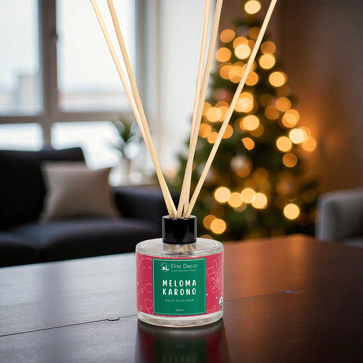 Reed Diffuser με άρωμα ”Μελομακάρονο” – το απόλυτο Χριστουγεννιάτικο άρωμα. Απελευθερώνει αργά το άρωμα στον χώρο χρησιμοποιώντας fiber sticks. Είναι μια δημοφιλής εναλλακτική στα κεριά, προσφέροντας συνεχή αρωματική απόδοση για αρκετές εβδομάδες χωρίς τη χρήση φλόγας.