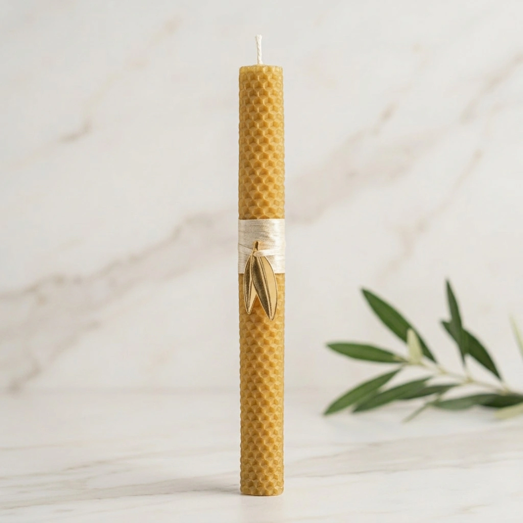 Χειροποίητη λαμπάδα από 100% φυσικό μελισσοκέρι σε χρυσό χρώμα. Διακοσμημένη με κορδέλα και χρυσά φύλλα ελιάς. Είναι φτιαγμένη από φυσικά υλικά, εξασφαλίζοντας μία ασφαλή και ποιοτική επιλογή για την γιορτή του Πάσχα.