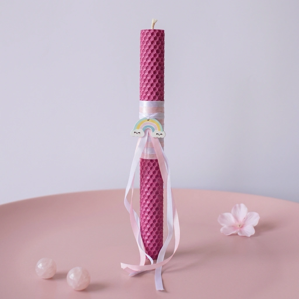 Χειροποίητη παιδική λαμπάδα από 100% φυσικό μελισσοκέρι. Είναι διακοσμημένη με κορδέλες και ξύλινο ουράνιο τόξο. Το σχέδιο της προσφέρει μία παιχνιδιάρικη και χαρούμενη διάθεση, ιδανική για να ενθουσιάσει μικρούς και μεγάλους. Είναι φτιαγμένη από φυσικά υλικά, εξασφαλίζοντας μία ασφαλή και ποιοτική επιλογή για την γιορτή του Πάσχα.